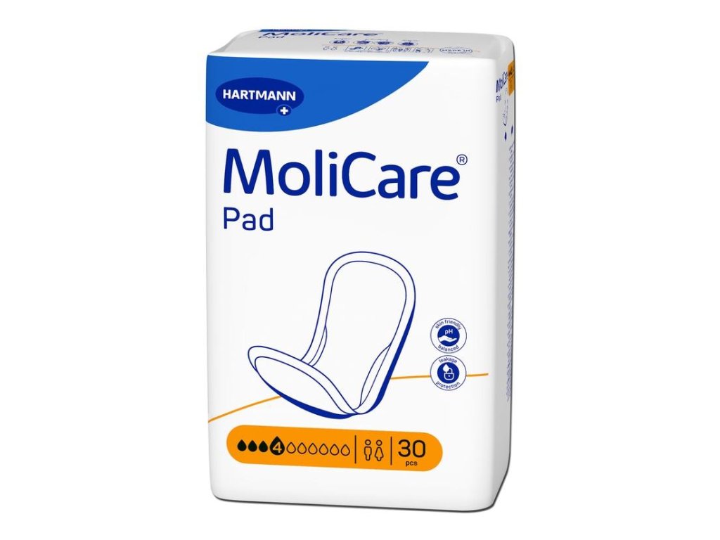 MoliCare Pad 4 kapky maxi je vložka s anatomickým tvarem a speciálním super suchým rounem Dry-Plus, který účinně pohlcuje pachy. Je vyvinutá pro péči o ženy s lehkým až středním oslabením močového měchýře. Výhodou této vložky je její praktický kompaktní tvar, který neomezuje volnost pohybu při nošení. Uniklá moč je velmi rychle absorbována a rozptýlena po celém objemu vložky, což zabrání zpětnému pronikání na její povrch.
