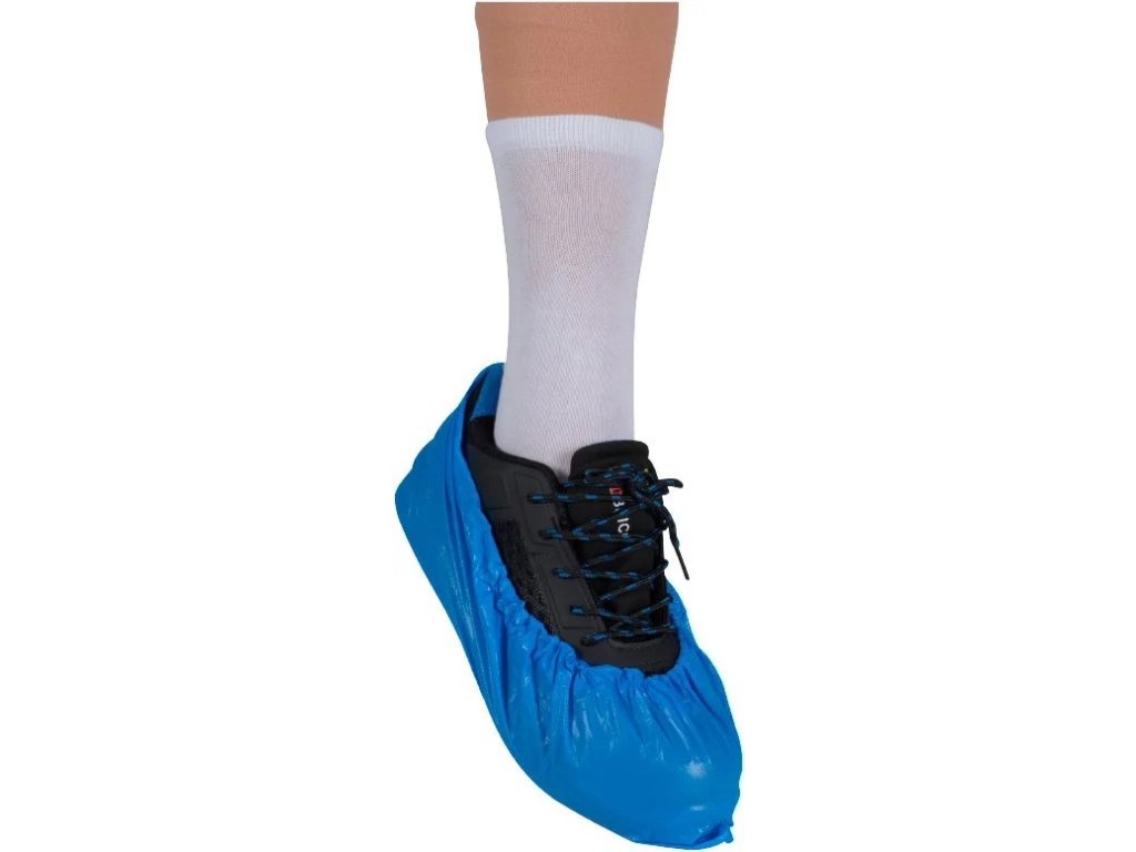 Plastový návlek na obuv modré barvy v prodloužené velikosti, ideální pro použití v různých prostředích, jako jsou nemocnice, lékárny, laboratoře, potravinářský průmysl, apod. Návlek je vyroben z LDPE (měkký igelit) a má gumičku pro snadné použití a držení na obuvi. Návlek je bez zápachu a netoxický, s protiskluzovou úpravou a vhodný pro velikost obuvi 42 - 45. Používá se k ochraně obuvi proti nečistotám, bakteriím, infekcím a dalším škodlivinám. Balení obsahuje 100 ks, každý o rozměru 15 x 41 cm a tloušťce 50µ. Návlek je modré barvy.